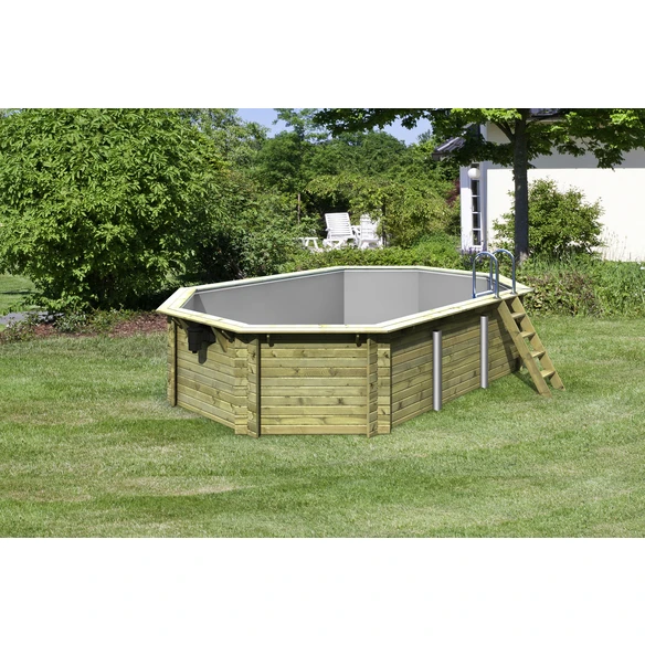 KARIBU Pool, beige, 19,5 l, Pool aus chromfreien kesseldruckimprägniertem Rundprofilhölzern, immer inklusive hochwertigem Unterlegvlies und 0,6 mm starker Poolfolie mit Einhängebiese, Do ist yourself. Einfache Montage durch aufeinander stecken der Bohlen, wasserabweisende Profilierung, inkl. hochwertiger Edelstahl- und Holzleiter