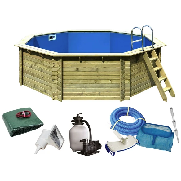 KARIBU Rundpool, braun, BxH: 428 x 124 cm, mit Holz-Außenleiter und Tiefbeckenleiter, 38 mm Blockbohlen mit Doppelnut und -feder, 0,6 mm dicke PVC-Innenfolie