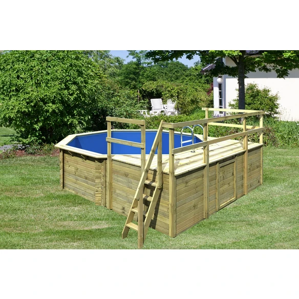 KARIBU Rundpool »Var. D«, braun, BxHxL: 428 x 124 x 420 cm, mit Holz-Außenleiter und Tiefbeckenleiter, 38 mm Blockbohlen mit Doppelnut und -feder, 0,6 mm dicke PVC-Innenfolie