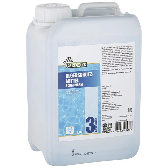 Mr. GARDENER Algenschutz, 3 l, zum Vernichten und Verhindern von Algenbefall, zur Grund- und Stoßbehandlung geeignet, schaumarmes Reinigungsmittel, mit Sicherheitsverschluss