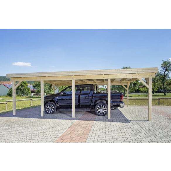 Mr. GARDENER Doppelcarport »Modern 2«, Außenmaß BxT: 600 x 760 cm, braun, Holzart: Fichte, Dacheindeckung aus Holz, aus naturbelassenem Fichtenholz gefertigt, stabil und langlebig, hält Schneelasten von bis zu 125 kg/m², kann mit dem seriengleichen Geräteraum ergänzt werden