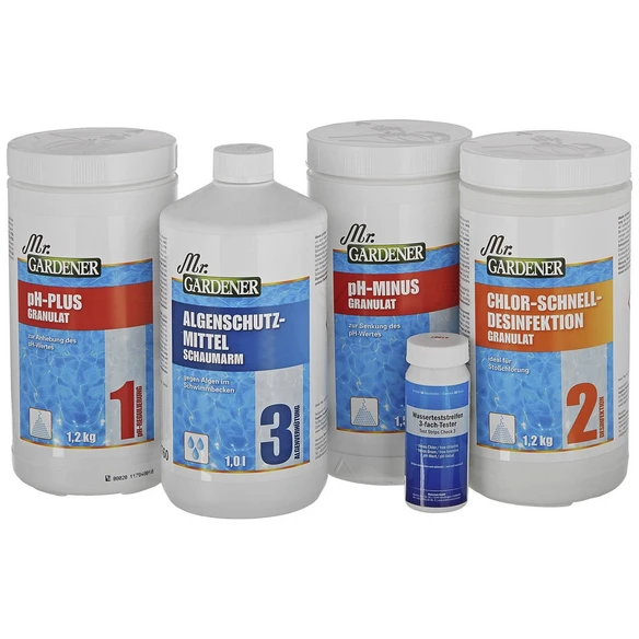 Mr. GARDENER Wasserpflege, BxH: 42 x 10 cm, für Schwimmbecken, Wasserpflege-Set für den Einstieg, Desinfektion mit Chlor, Verschiedene Wasserpflegemittel für Ihr Schwimmbad, Für schnelle und langanhaltende Sauberkeit, Inkl. Wassertester und hilfreicher Pflegefibel