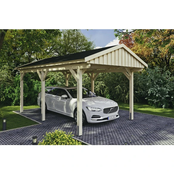 SKANHOLZ Carport »Fichtelberg«, BxT: 317 x 566 cm, Firsthöhe: 303 cm, unbehandelt, Satteldach-Carport, Massive Konstruktion aus hochwertigem Leimholz (BSH-Fichte), Farblich unbehandelt, Dachschalung inklusive schwarzen Schindeln, Pfosten 12 x 12 cm
