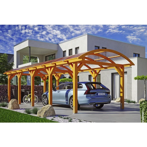SKANHOLZ Carport »Franken«, BxT: 376 x 969 cm, Firsthöhe: 293 cm, lasiert, Runddach-Carport, Massive Konstruktion aus hochwertigem Leimholz (BSH-Fichte), farblich behandelt, Dacheindeckung Polycarbonat-Dach-Doppelstegplatten in klar, Pfosten 14 x 14 cm