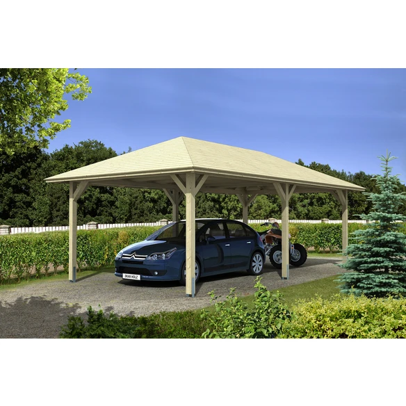 SKANHOLZ Carport »Taunus«, BxT: 439 x 786 cm, Firsthöhe: 329 cm, unbehandelt, Zeltdach-Carport, massive Konstruktion aus hochwertigem Leimholz (BSH-Fichte), farblich unbehandelt, Sparrendach mit 20 mm Dachschalung, Pfosten 12 x 12 cm