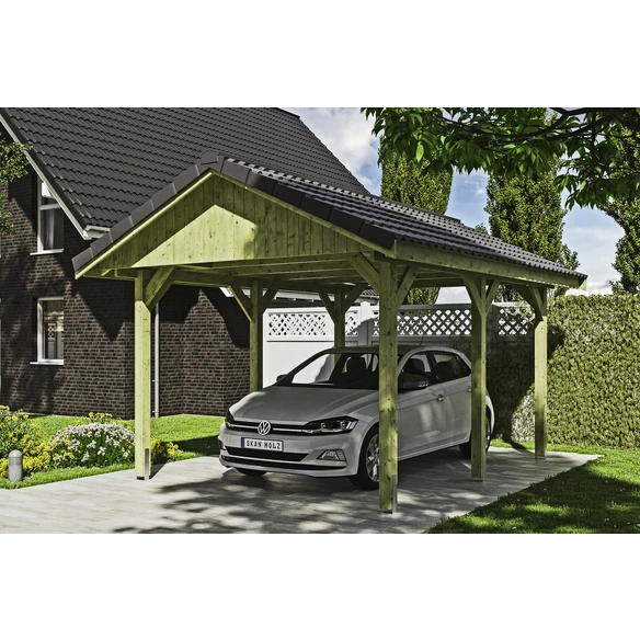SKANHOLZ Carport »Wallgau«, BxT: 380 x 500 cm, Firsthöhe: 313 cm, imprägniert, Satteldach-Carport, Konstruktion aus imprägniertem Nadelholz, Grün imprägniert, Sparrendach mit Dachlatten (ohne Dachziegel), Pfosten 11,5 x 11,5 cm