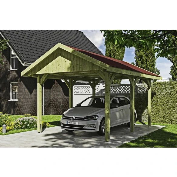 SKANHOLZ Carport »Wallgau«, BxT: 380 x 500 cm, Firsthöhe: 313 cm, imprägniert, Satteldach-Carport, Konstruktion aus imprägniertem Nadelholz, Grün imprägniert, Dachschalung inklusive roten Schindeln, Pfosten 11,5 x 11,5 cm