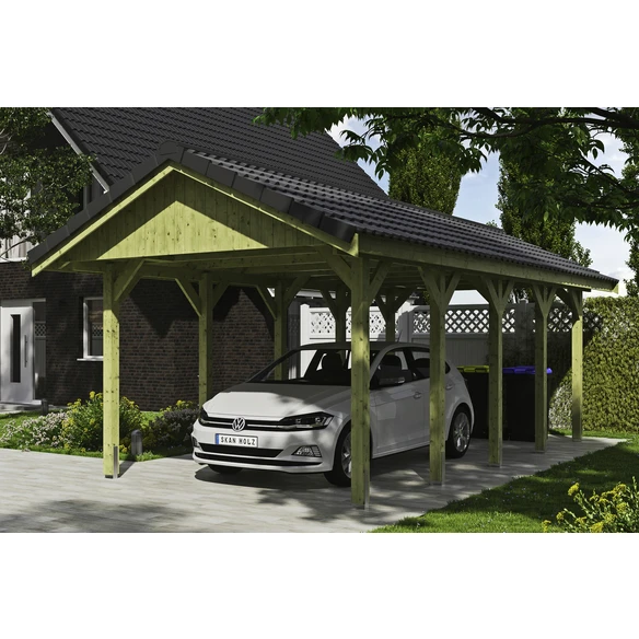 SKANHOLZ Carport »Wallgau«, BxT: 380 x 750 cm, Firsthöhe: 313 cm, imprägniert, Satteldach-Carport, Konstruktion aus imprägniertem Nadelholz, Grün imprägniert, Sparrendach mit Dachlatten (ohne Dachziegel), Pfosten 11,5 x 11,5 cm
