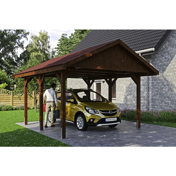 SKANHOLZ Carport »Wallgau«, BxT: 430 x 500 cm, Firsthöhe: 326 cm, lasiert, Satteldach-Carport, Konstruktion aus imprägniertem Nadelholz, farblich behandelt, Dachschalung inklusive roten Schindeln, Pfosten 11,5 x 11,5 cm