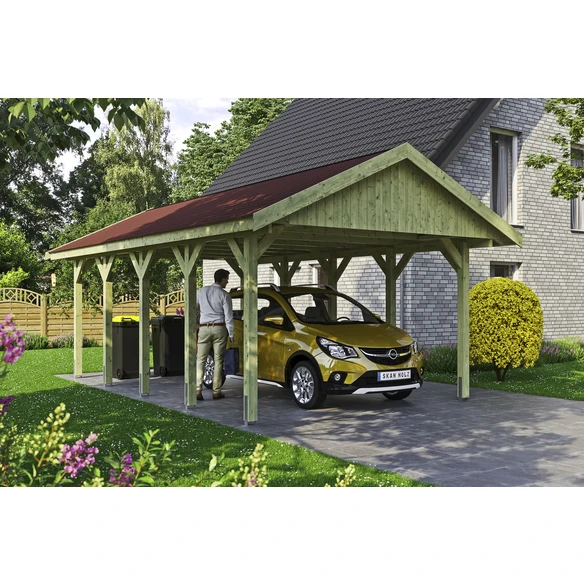 SKANHOLZ Carport »Wallgau«, BxT: 430 x 750 cm, Firsthöhe: 326 cm, imprägniert, Satteldach-Carport, Konstruktion aus imprägniertem Nadelholz, Grün imprägniert, Dachschalung inklusive roten Schindeln, Pfosten 11,5 x 11,5 cm