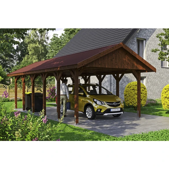 SKANHOLZ Carport »Wallgau«, BxT: 430 x 900 cm, Firsthöhe: 326 cm, lasiert, Satteldach-Carport, Konstruktion aus imprägniertem Nadelholz, farblich behandelt, Dachschalung inklusive roten Schindeln, Pfosten 11,5 x 11,5 cm