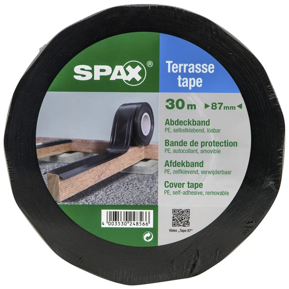 SPAX Abdeckband, Einsatz: Terrassenbau, schützt die Holz-Unterkonstruktion vor Niederschlagwasser, Polyethylenband mit geringer Dichte, selbstklebend, lösbar ohne Rückstände, UV-resistent, stoßfest, Materialstärke: 0,5 mm;Abmessung: 30 m x 87 mm auf Rolle