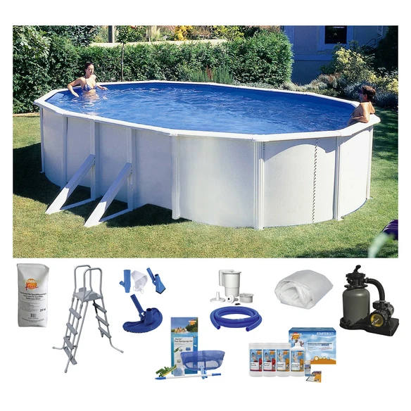 SUMMER FUN Ovalpool, weiß, BxHxL: 375 x 120 x 610 cm, Ovalformbeckenset, 0,45 mm starke Stahlwand und 0,4 mm dicke Folie, mit Sandfilteranlage, Skimmer und Filtersand, mit Leiter und Bodenschutzplane, mit Wasserpflegeset, Reinigungsset und Bodensauger