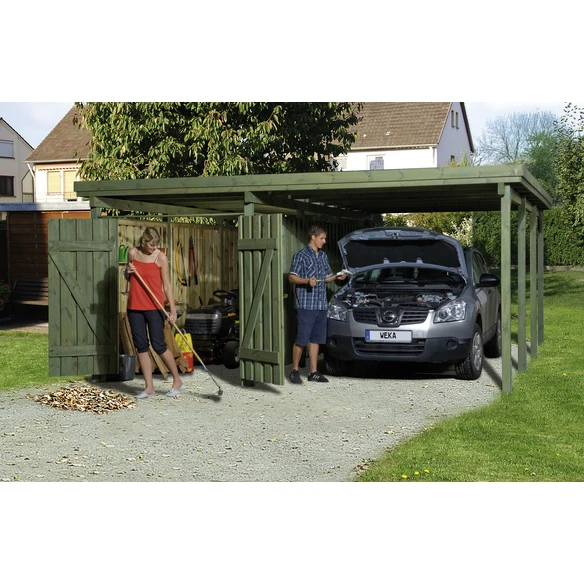 WEKA Carport, holzfarben, 20mm Wandstärke, integrierter XXL Geräteschuppen, graues PVC-Kunststoffdach mit Trapezprofil, Durchfahrtshöhe:215cm, Druchfahrtsbreite:270cm